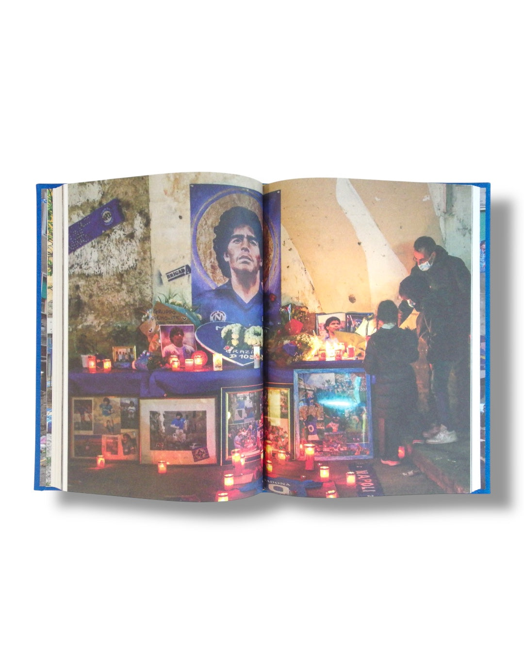 El resultado es un directorio compacto, elegante y cargado de ironía seria. Cada imagen funciona como estampa y como comentario social. Y hay un giro que lo aterriza en la calle: la iconografía de Maradona termina convertida, literalmente, en objeto de veneración popular en Nápoles, cerrando el círculo entre arte, fe e ídolo.